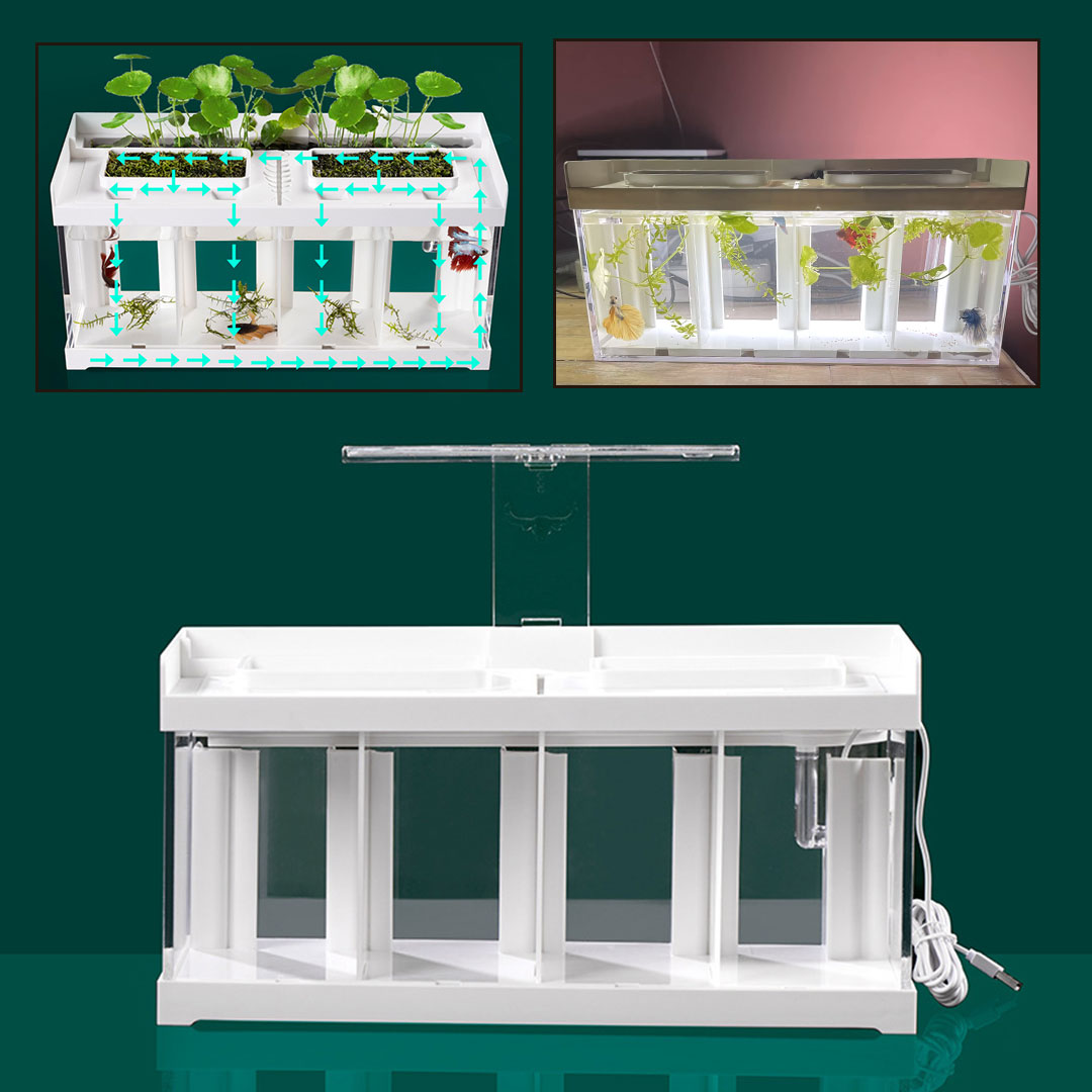 حوض اسماك قابل للتقسيم لعزل الاسماك عن بعضها لمنع القتال بينهم مع فلتر بيولوجي مدمج و انارة داخلية و خارجية و احواض زراعة لبيئة متكاملة