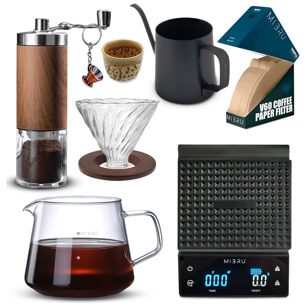 احصل على تجربة قهوة فريدة مع مجموعة تحضير القهوة v60 مع مطحنة خشبية جميلة بـ 8 وظائف مختلفة.
