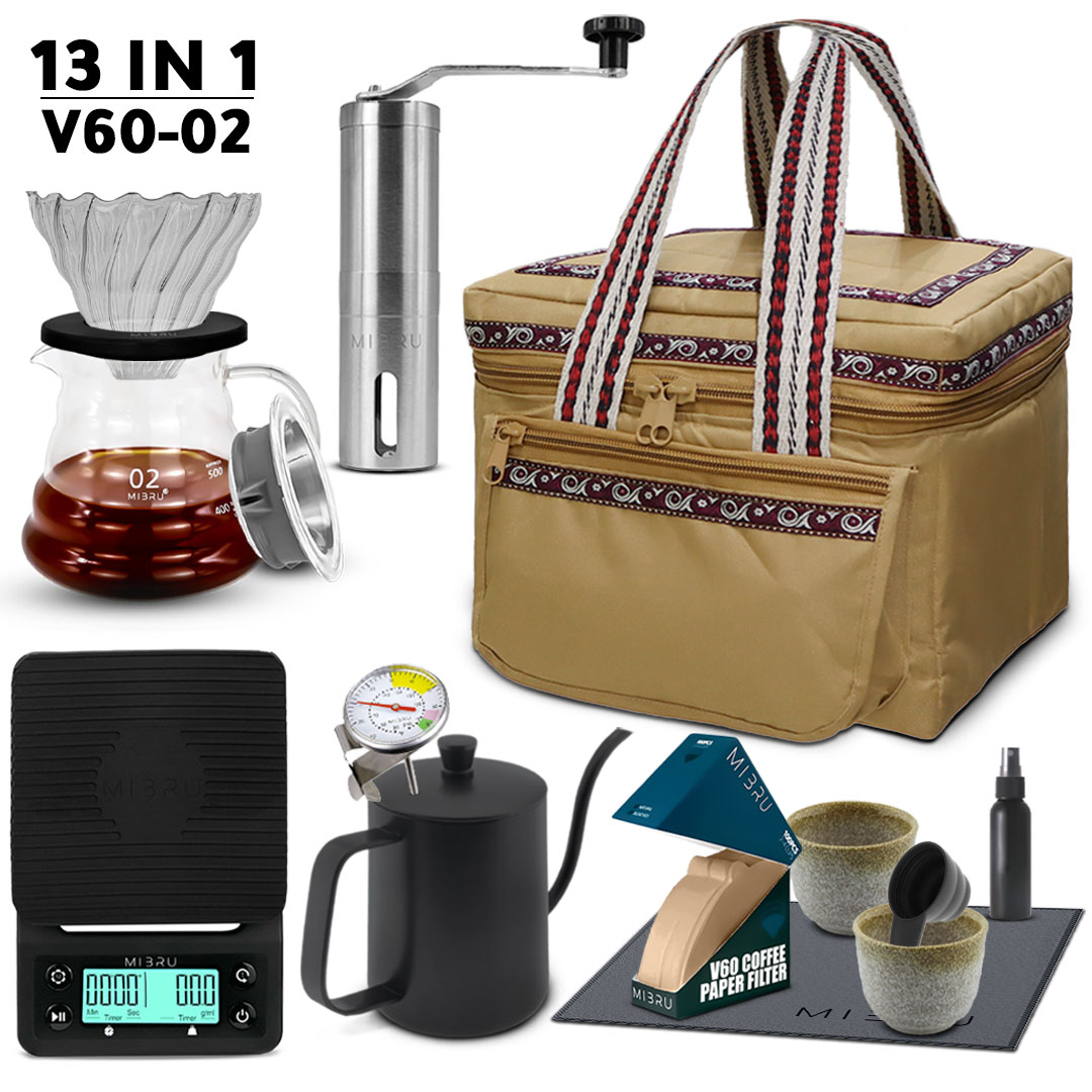 شنطة ادوات القهوة المختصة المتكاملة الخاصة بالرحلات لون بني مكونة من :