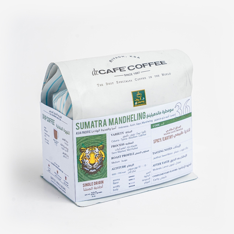 حبوب قهوة وحيدة المنشأ من أندونيسيا آتشيه، جايو، ماندهيلنج الذي تحتوي على مكونات ترابية وجاك فروت ونوتات شمام حلوة