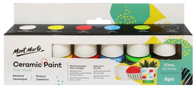 Use Mont Marte Signature Ceramic Paints on porcelain, china and glass to personalise your homewares and gifts. The set of 6 opaque colours can be mixed for an endless palette or diluted with water for a more translucent effect.